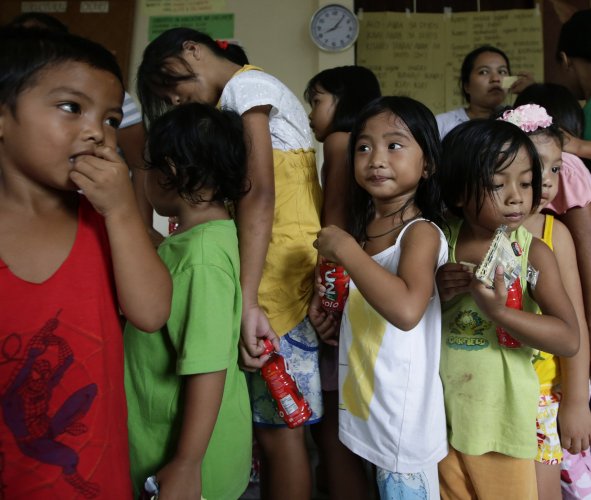 Children queue for food at a damaged daycare centre in Basey township, Eastern Samar province [Bullit Marquez/AP/Press Association Images]