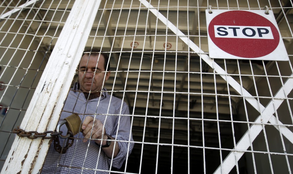 A ferry-boat crew member locks the ship's entrance during a strike at Piraeus port near Athens.Yiorgos Karahalis / Reuters