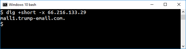 In the case of last years story, there's little reason to believe IP spoofing was happening, but the conspiracy theory still breaks down for the same reason: the association between these concepts is not what you think it is. Listrak, the owner of the server at the center of the conspiracy, still reverse resolves the IP address 66.216.133.29 as "mail1.trump-email.com", either because they are lazy, or because they enjoy the lulz.