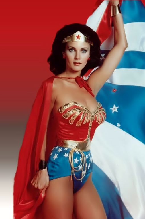 This is Lynda Carter in the most famous rendition of God, Mom and Apple Pie. Look at the colors, in how they are all bright and stimulate you to good feelings. Note she is Red White and Blue in all things are possible in the United States of America.