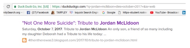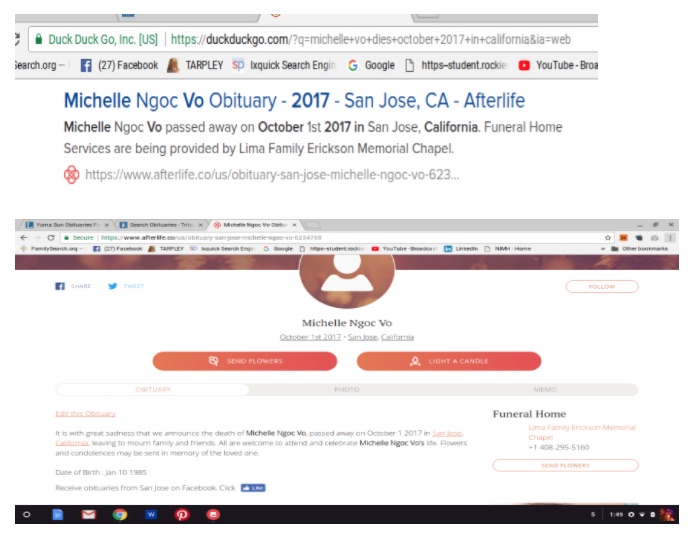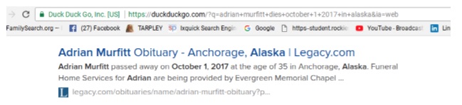 The second victim , Heather Alvarado, born 9/20/82 had a similar discrepancy in her two obituary notices. An earlier listing places her death in Enoch, UT:As with other examples examined here, the same problem occurs the obituary and search engine page -headline, where the link to the obit uary is not the same.