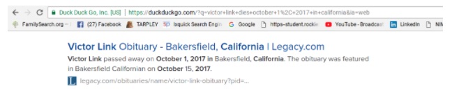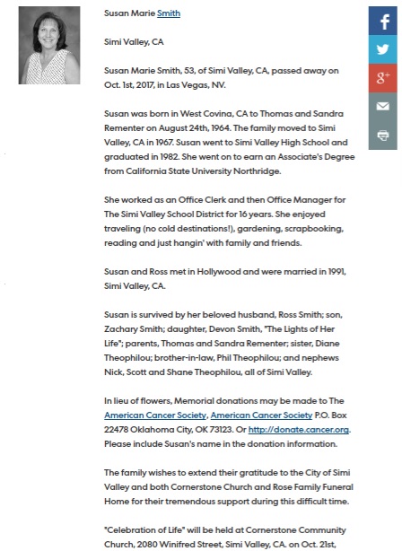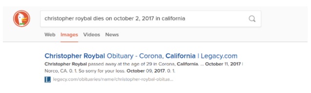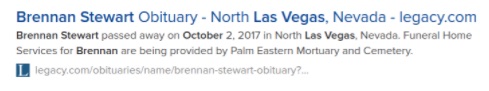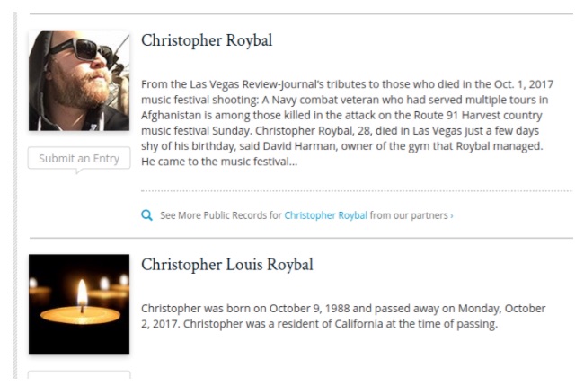 It was either missed by the production company that put together the shooting (Crowds on Demand) or else the title initially listed can not be changed. The content was changed but the search engine link , which was created first, tells the entire story. Mr. Roybal passed away , not in Las Vegas, NV, but in Corona , CA. The obituary , but not the search -engine heading for the obituary , was changed, a pattern that we will see emerge again and again.
