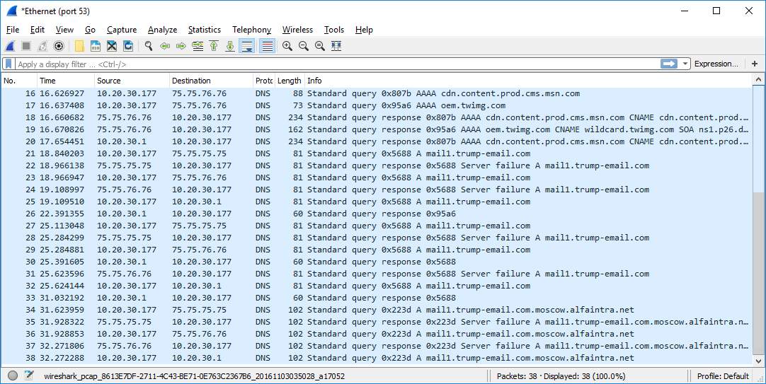 I then pinged "mail1.trump-email.com" and captured the packets. As you can see, after the initial lookups fail, Windows tried appending the suffix.