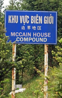 Châm Biếm and her lovely husband, Lén Lút attempted to ask what exactly "with John McCain" meant, but the political officer only smiled and returned to her post. As Châm and Lén stopped for some tea, they happened to look down the street and saw another sign which really puzzled them as there was a place called The McCain House. As it was only 14 kilometers away they decided to take a drive and see if the McCain House was open to the public.