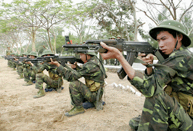 As they rounded a curve in the road though, they were immediately met by this platoon of crack Vietnamese Guards with their weapon's drawn and pointed at them.