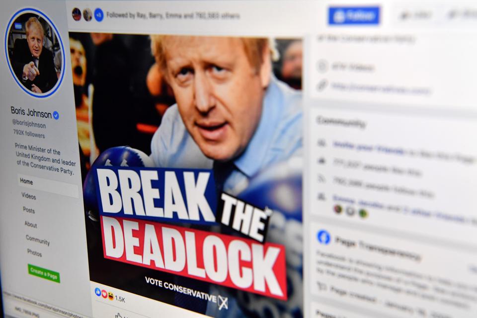 The Conservative Party spent millions on Facebook ads during the UK general election. (Photo by BEN ... [+] STANSALL/AFP via Getty Images)