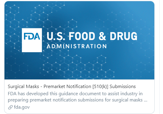 Take a look at this FDA regulation, intended to ease (!) the application process for "premarket notification." That means you have to do all of this--and get FDA sign off--before your new surgical mask gets anywhere near shelves. 2/