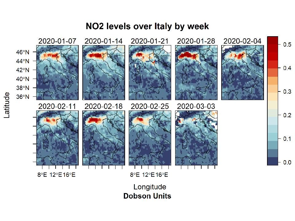 Nitrogen dioxide levels in the air above Italy's Po Valley decline as the country enters coronavirus ... [+] lockdown.