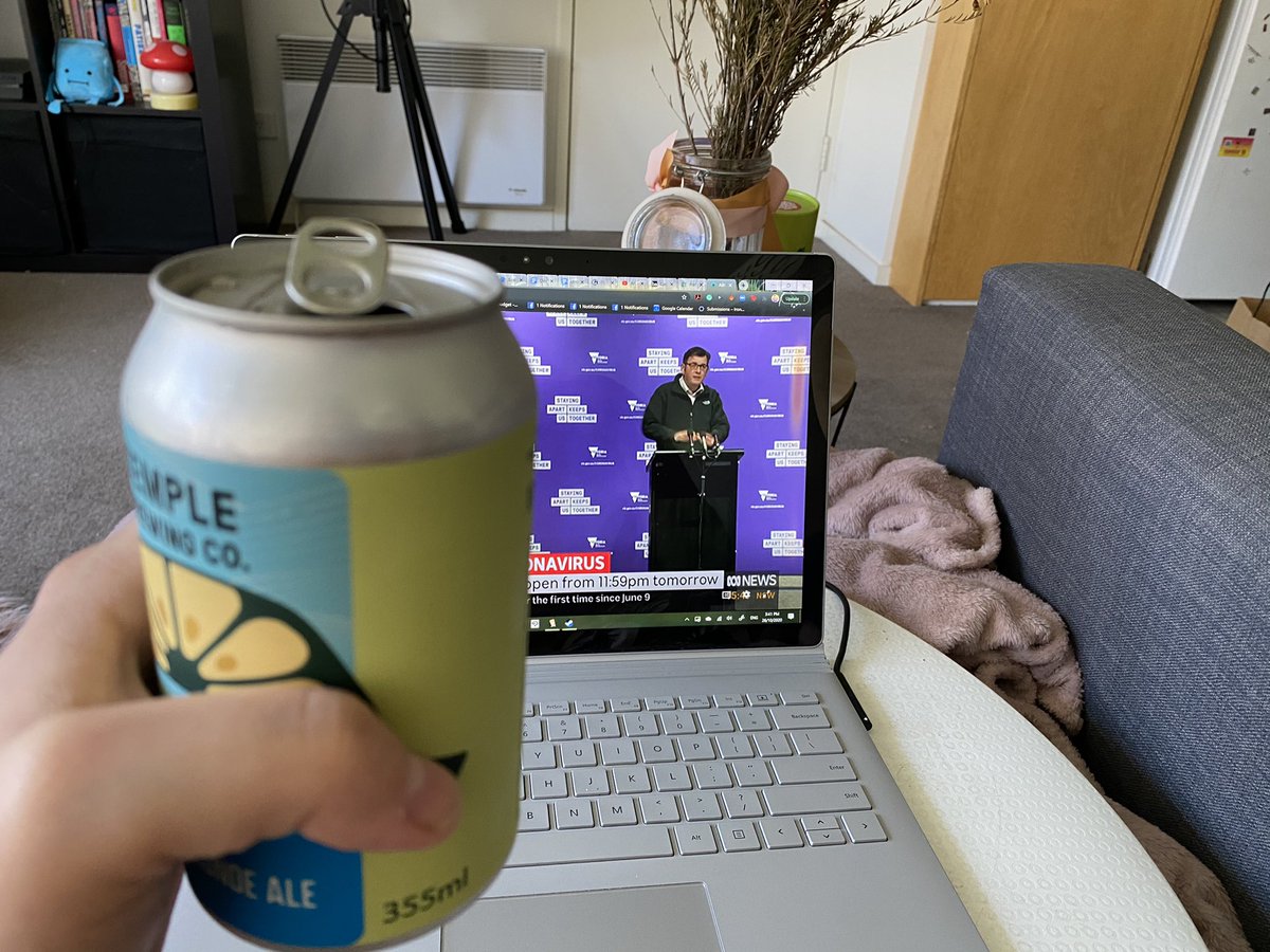 Asked by reporters about his famous quote from March at the start of the lockdown – “[that you can’t] have all your mates around to home and get on the beers”) – Andrews announced he would in fact be reaching for the spirits.
