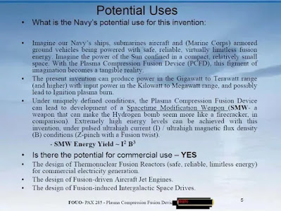 “ Under uniquely defined conditions, the Plasma Compression Fusion Device can lead to development of a Spacetime Modification Weapon (SMW- a weapon that can make the Hydrogen bomb seem more like a firecracker, in comparison). Extremely high energy levels can be achieved with this invention, under pulsed ultrahigh current (I) / ultrahigh magnetic flux density (B) conditions (Z-pinch with a Fusion twist).“