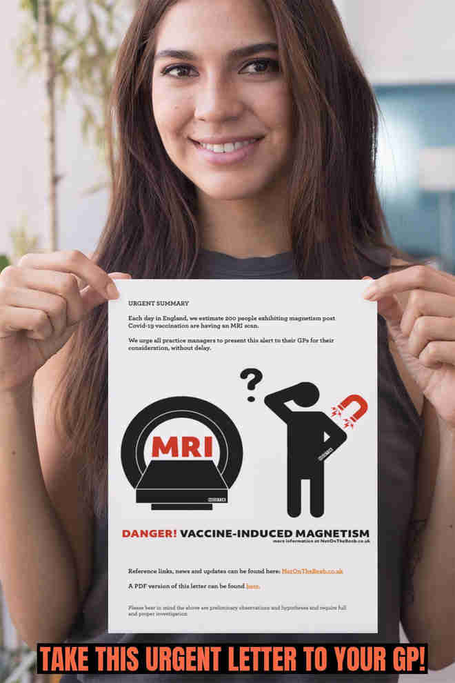 Hypothesis by Dr Andrew Goldsworthy The vaccine-induced magnetism hinges around the possibility that a graphene-like compound was used as an adjuvant to increase the rate of uptake of the mRNA. This is based on electron microscopy, where graphene oxide was found to be in the vaccine. See here It has been difficult to obtain further samples for investigation because the manufacturers insist that all unused vials and used syringes have to be returned after the shots are delivered. Why the secrecy? This may be the reason. Follow this link to an open-access review on the toxicity of the graphene family (including graphene oxide). It looks pretty horrific. Also, see this . But how could this have happened since neither graphene or graphene oxide are magnetic? The answer is that both graphene and graphene oxide, can conduct enough electricity across the cell membranes to magnetise nearby superparamagnetic particles such as ferritin and magnetite to cause a widespread magnetisation of people receiving the vaccine. It's just as the iron core of an electromagnet becomes magnetised when an electric current is passed through the coil of wire wound around it. To make this argument more quantitative; the electrical conductivity of graphene on the nano scale is two orders of magnitude greater than copper See here What does this mean for living cells? The answer is that the transmembrane voltage gradient of living cells is of the order of ten million volts per metre (100 mV across a 10 nm membrane). This means that a transmembrane strand of graphene or graphene oxide (from the vaccine) could carry a huge electric current and be likely to magnetise any superparamagnetic materials such as ferritin or magnetite that may be close by. This effect could spread like wildfire across the membrane as each magnetized particle magnetizes its neighbours and then to those of the next cell, so that the magnetic effect increases and Ultimately, it could spread to all parts of the body via the bloodstream, starting with the blood cells themselves, including those white cells needed for our immune system, then the veins, then the heart, followed by the lungs and finally the brain. Wherever It goes, it could wreak havoc with cell permeability and have all sorts of biological effects, including heart failure, premature Alzeimer's disease and, when the mitochondria are affected, chronic fatigue. Another effect is that membrane damage to our sensory cells could make them hyperactive and send false signals to the brain to give symptoms very similar to electromagnetic hypersensitivity (EHS) resulting in headaches whenever we use a mobile phone, pins and needles when straying too close to a WiFi router dizziness and nausea, to name but a few. Perhaps the most serious danger is if you have an MRI scan, when the extremely powerful magnet in the machine would try to pull these magnetised particles out of your body and, in the case of the brain or spinal cord scan, immediate and possibly permanent damage could result. When other parts of the body are scanned, the results may be less noticeable in the short term, but become apparent later as an unexplained "idiopathic" illness. This needs careful monitoring by an independent observer. Best wishes, Dr Andrew Goldsworthy Lecturer and Biological Safety Officer (retired) Imperial College London