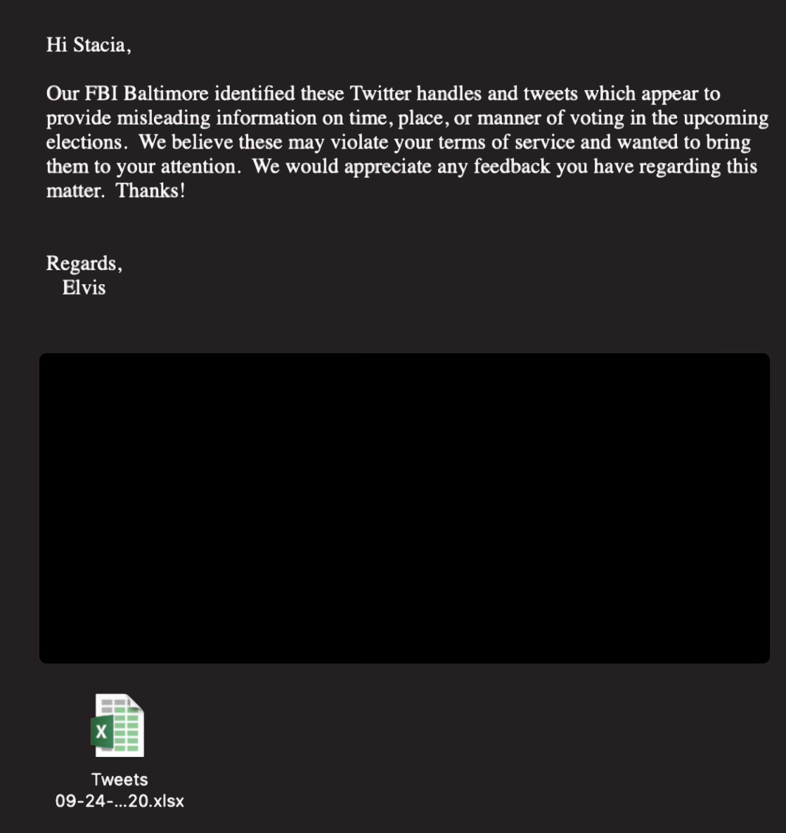 4. Especially as the election approached in 2020, the FITF/FBI overwhelmed Twitter with requests, sending spreadsheets with hundreds of accounts: